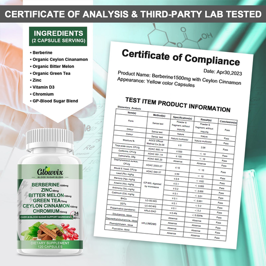 GLOWVIX Berberine Supplement Capsules with Bitter Melon, Chromium, Zinc & Other Natural Herbs